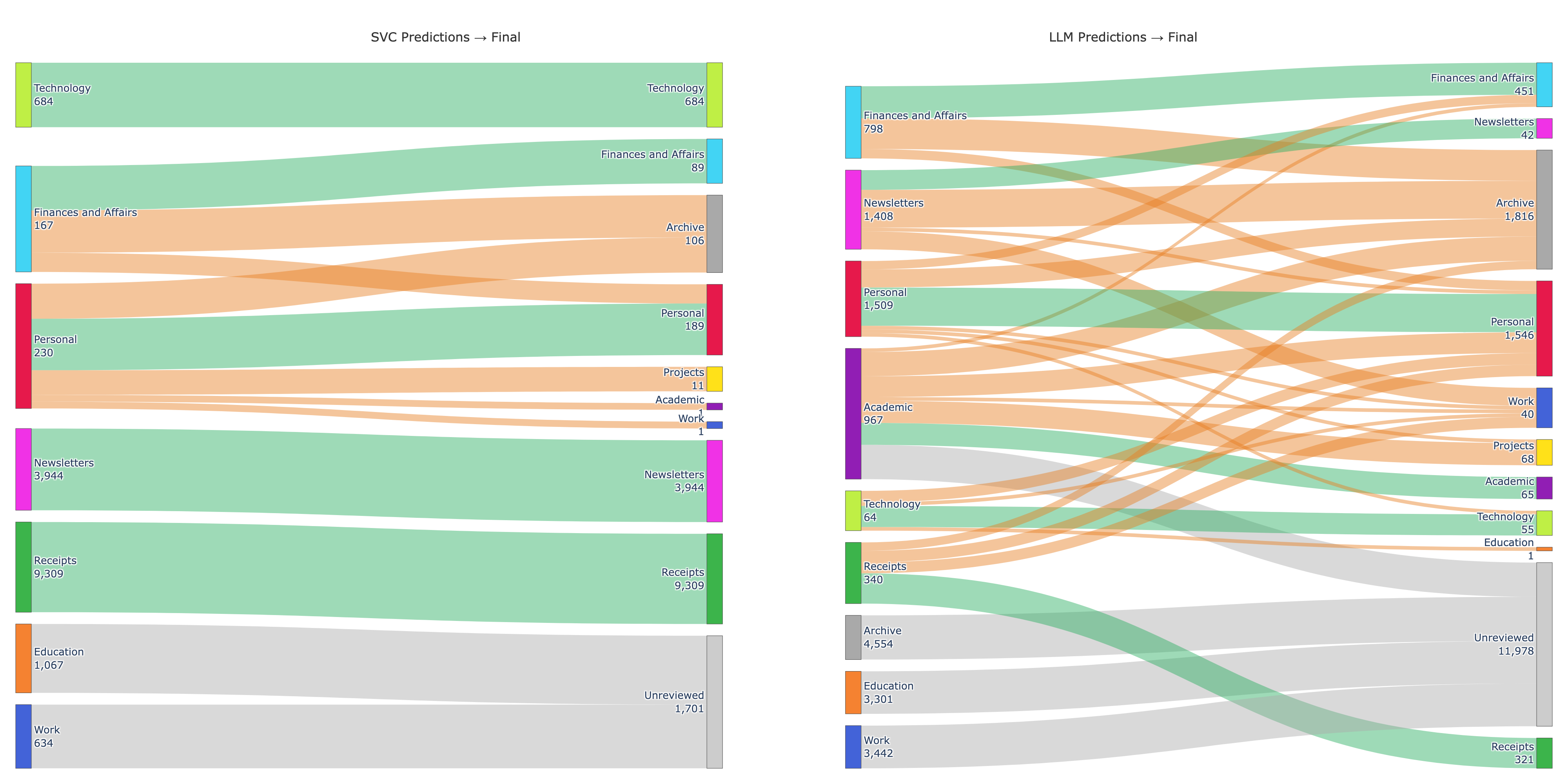The second panel tells a different story. Of 4,405 reviewed LLM predictions, 2,005 were reassigned (45.5%). The large grey7 Unreviewed set in the LLM panel represents 11,978 emails that were classified but never moved — predominantly Work (3,012) and Education (2,562), which together accounted for 65% of the total LLM load. The assigned categories for this group were quite poor, and I did not relish the thought of teasing these out manually.