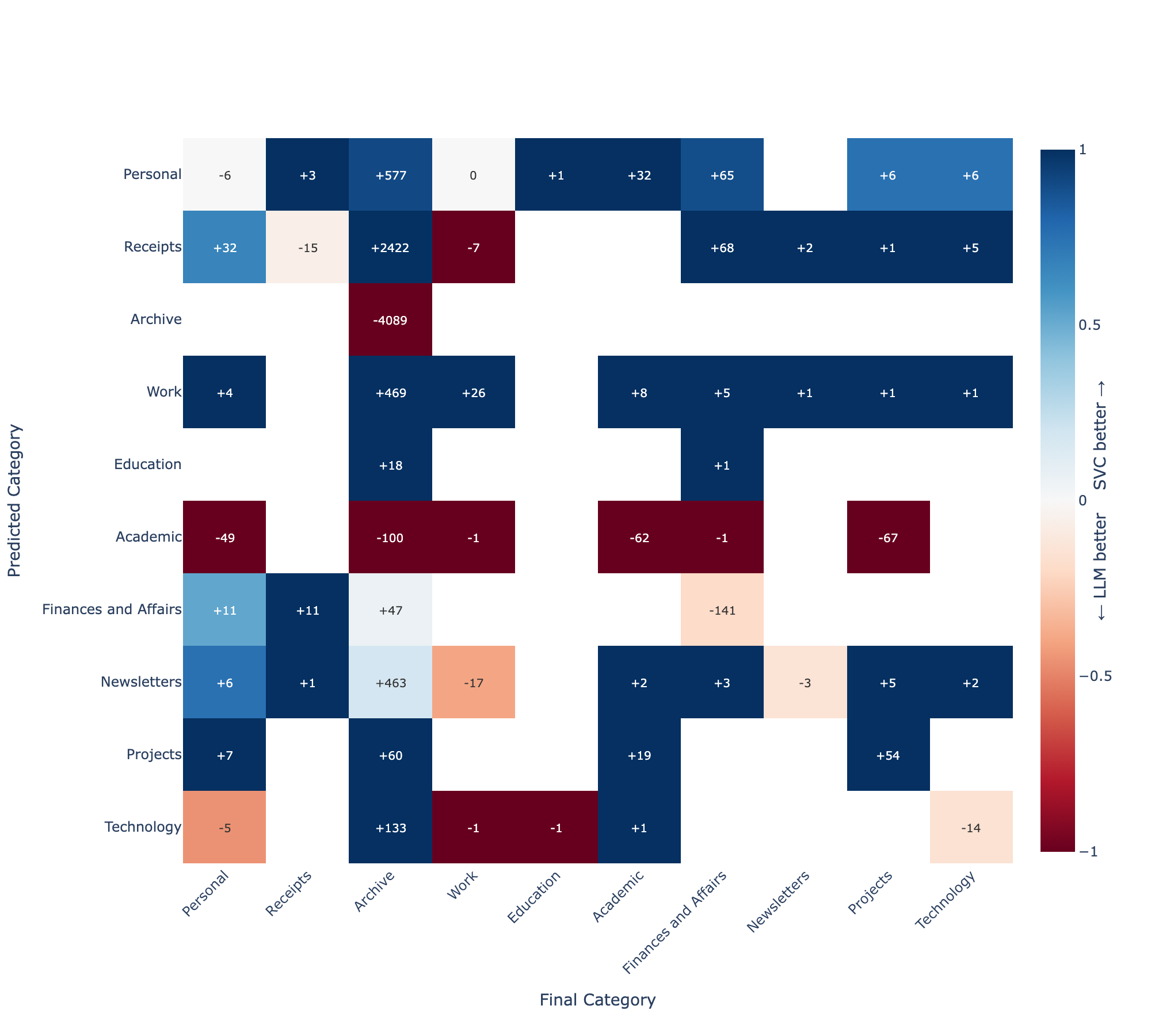 To tease this out, I made a heatmap which compared the predicted category from both SVC and LLM with the final accepted category after review8. Predicted category is shown on the y-axis, and final category (after review) is shown on the x-axis. Colours represent whether the SVC model or the LLM were more predictive of final category - bluer tones indicate SVC outperforming the LLM, and redder tones indicate the LLM outperforming the SVC. Labels within the heatmap indicate the number of emails in each predicted/accepted category pair.